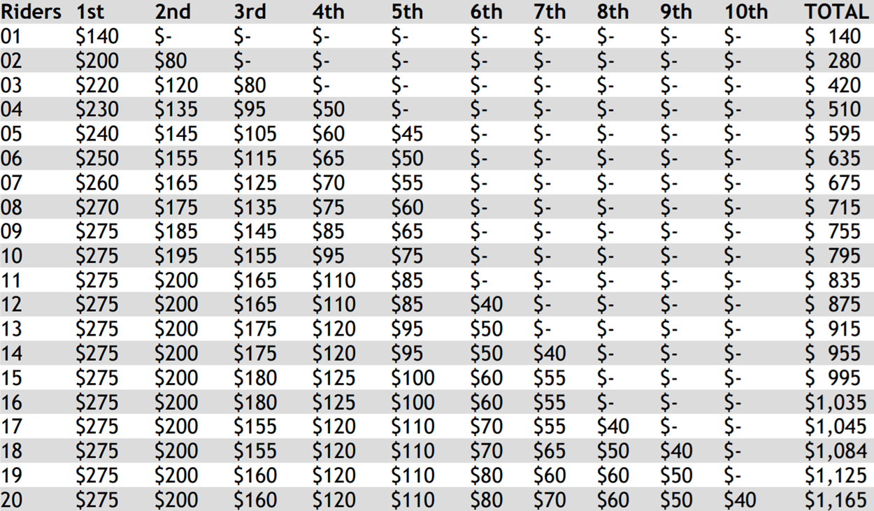 Trophy or Plaque to the top 5 Guaranteed (top 1/3 after 5 riders) 100% to 50’s